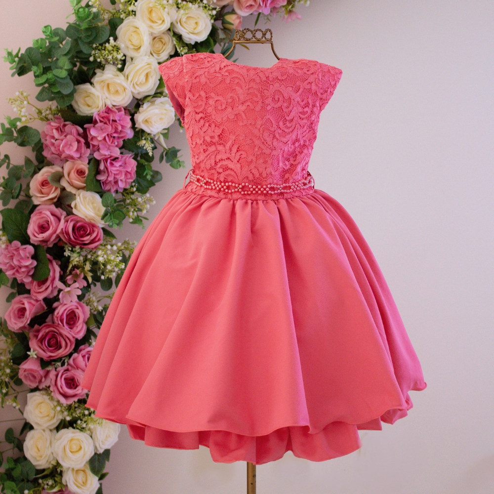 Vestido juvenil confeccionado com tecido liso na cor coral, com peito detalhe renda, saia ampla e babado no forro.