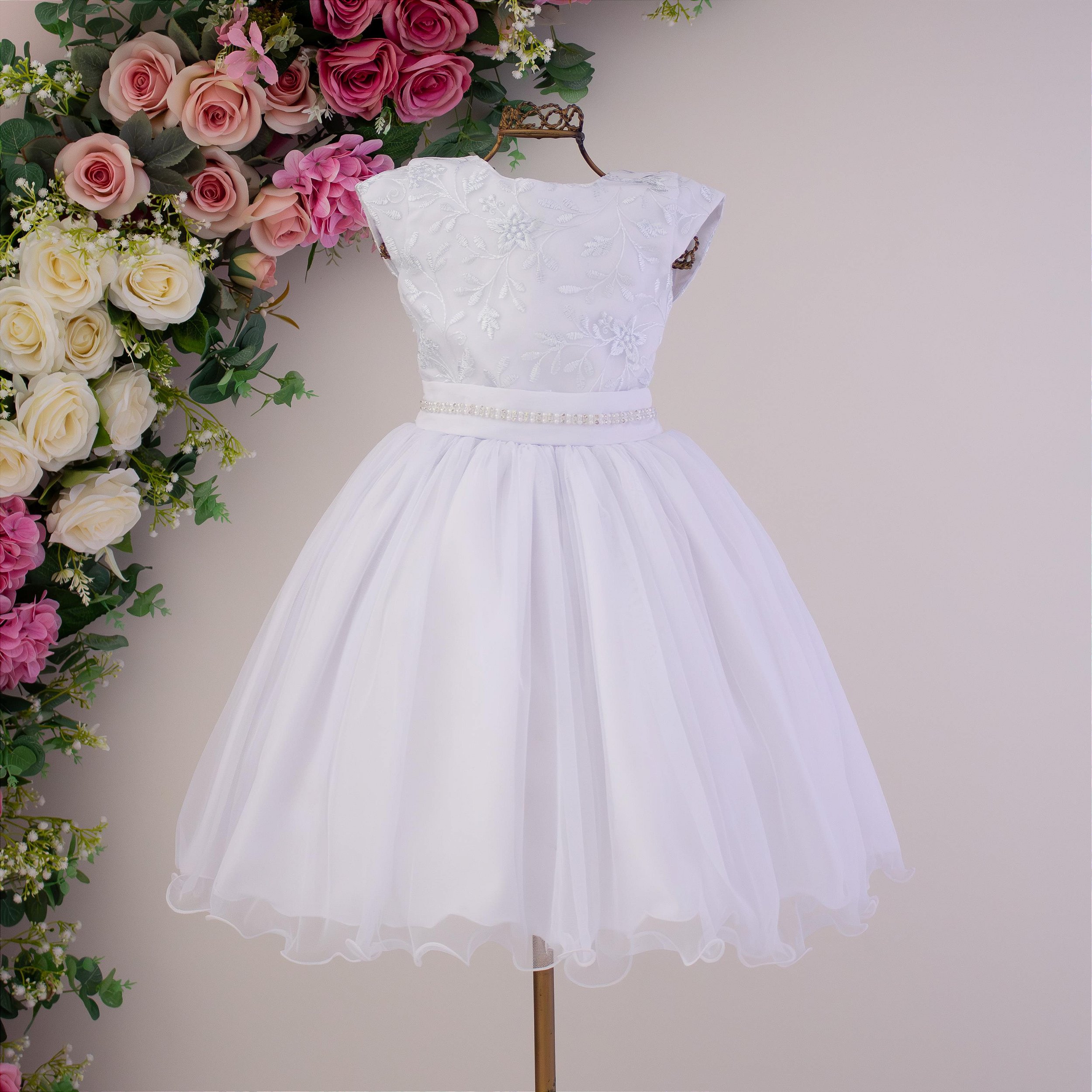 Vestido Infantil Juvenil Branco Bordado Cintura 4 ao 16